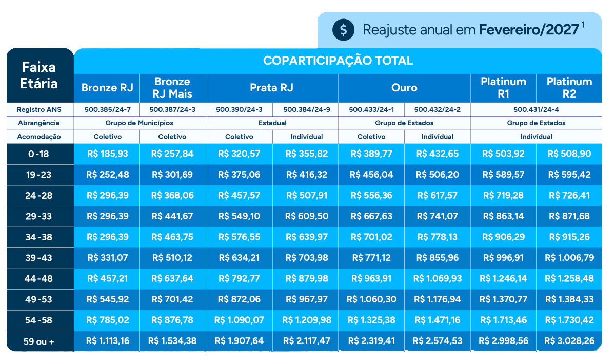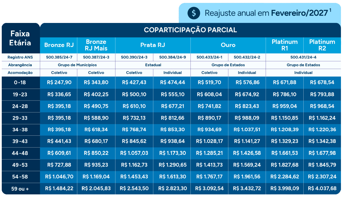 As tabelas de preços dos planos sem ou com coparticipação são válidas para as seguintes entidades e públicos: